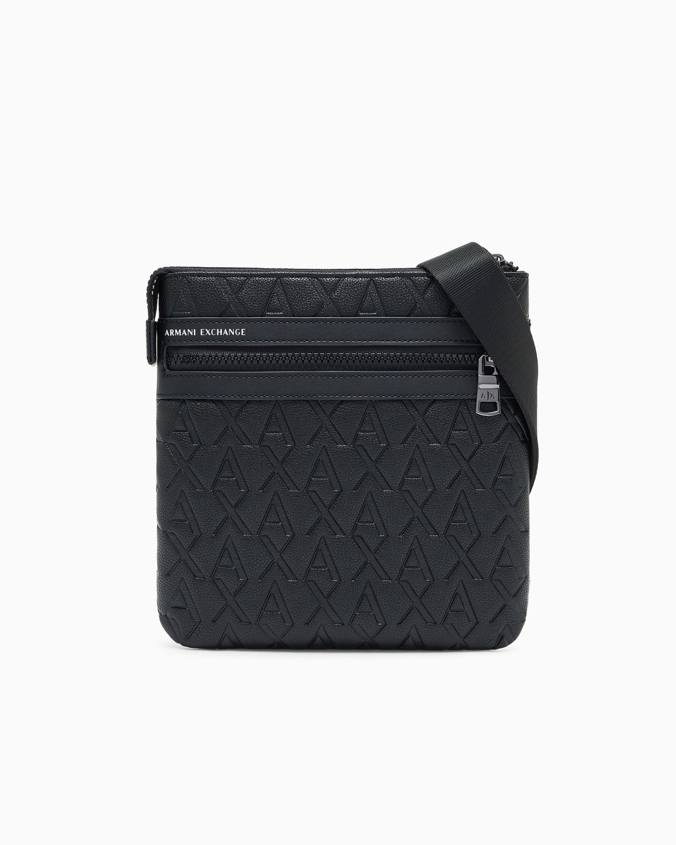 Compacto, fresco, indispensable. Este bolso de hombro plano está elaborado con un material con un logotipo grabado en toda su superficie para lograr un aspecto distintivo y moderno. Práctico gracias al cierre de cremallera, bolsillo exterior y bandolera ajustable, es el accesorio ideal para completar cada outfit con un toque urbano y funcional.