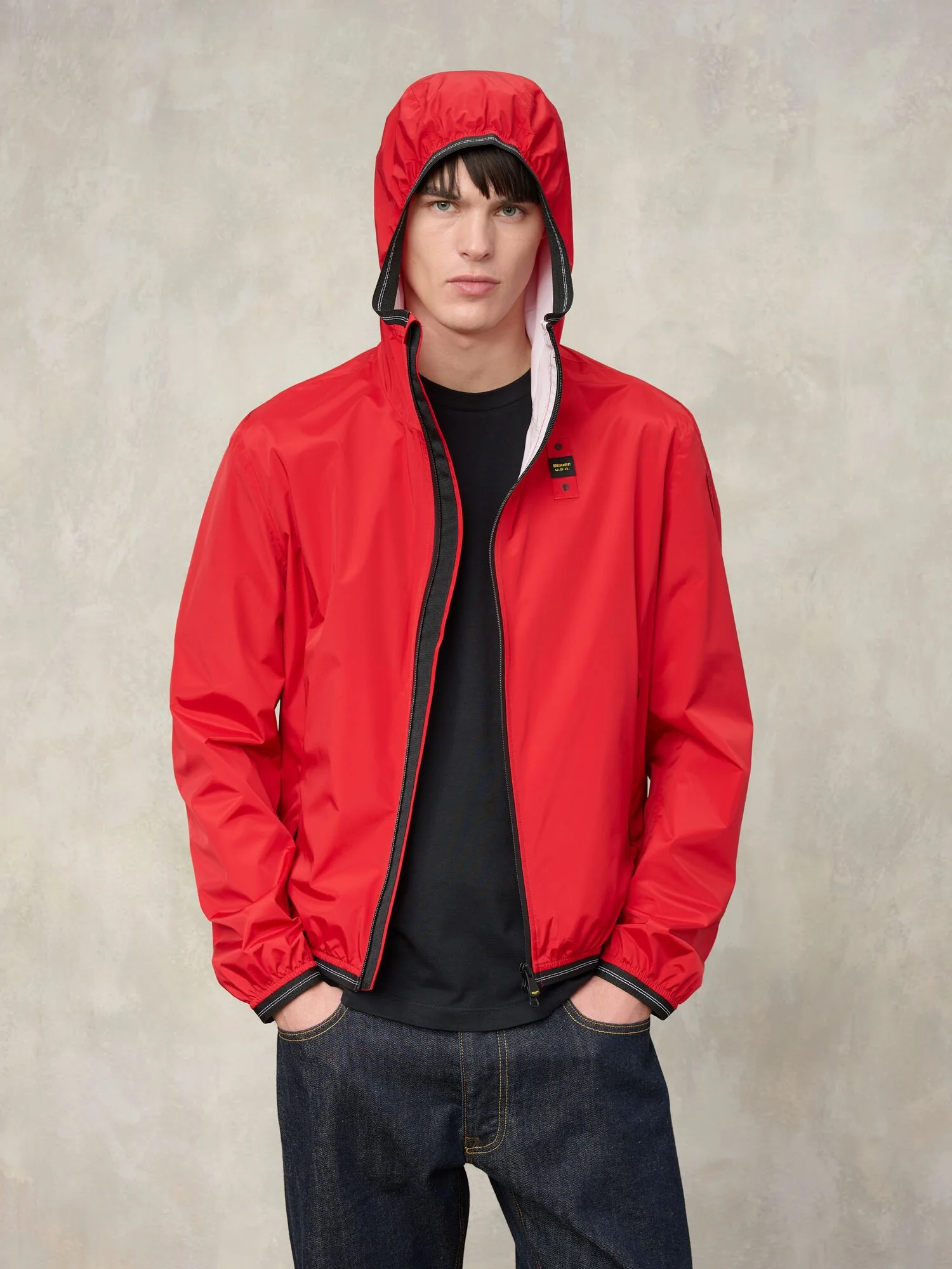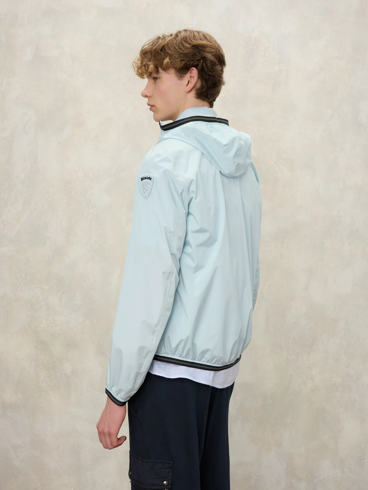 Chaqueta a viento en nylon ligeramente elastizada en colores de moda y sin forro con capucha fija. Prenda indicada para las frescas tardes y para las excursiones fuera de la ciudad.
