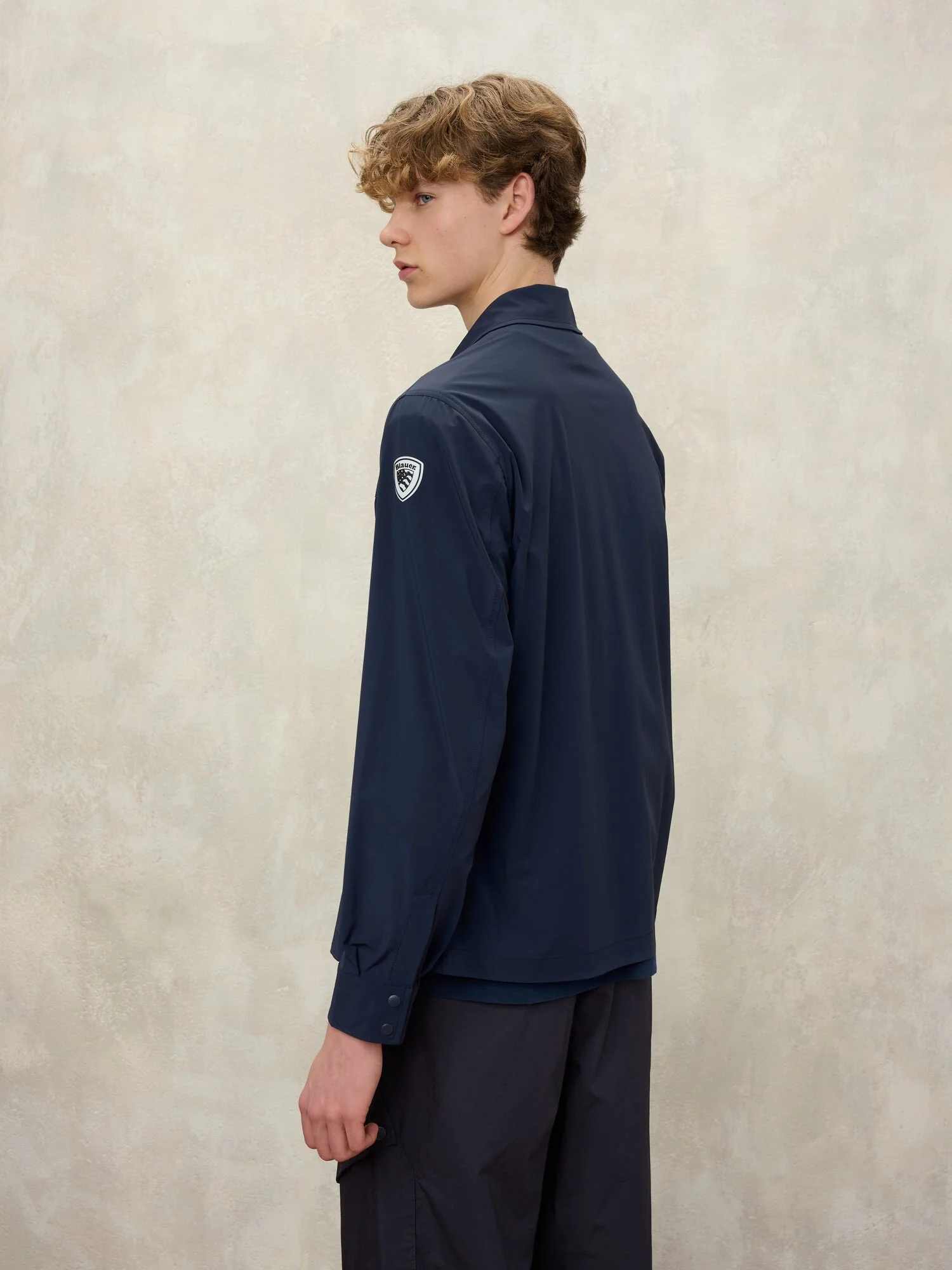 Chaqueta sin forro monocolor con cuello tipo camisa de estilo esencial y limpio. Tejido liso y elastizado con tacto suave y ligero que combina bien con la ropa casual.